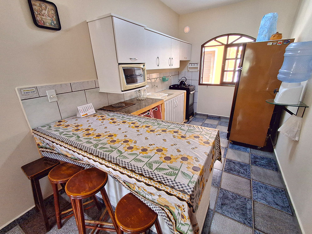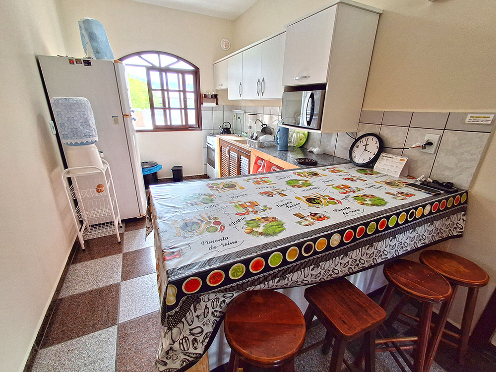 - Cozinha completa (com balcão com bancos para refeições, liquidificador, microondas e bombona para água)