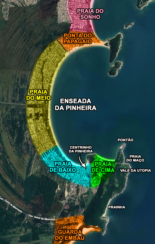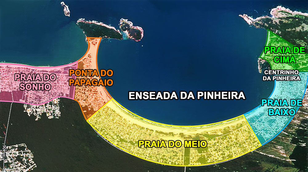 | Praia do Meio A Praia do Meio, como o próprio nome indica, está situada no centro da Enseada da Pinheira (Mar Aberto), é o trecho menos movimentado da região. Combina beleza natural com a praticidade de fácil estacionamento e uma ampla faixa de areia, garantindo espaço de sobra para o seu guarda-sol. Com mar geralmente calmo, é muito procurada por famílias e por quem busca tranquilidade, além de oferecer uma paisagem agradável e vista para a Ilha do Papagaio (conforme foto abaixo), sendo ideal tanto para o lazer durante o dia quanto para caminhadas ao entardecer. ![]() |