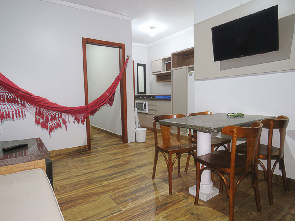 Panorâmica da sala, sendo que todos os apartamentos tem sacada com vista para o mar (exceto os térreos). Na sala está instalado o aparelho de televisão. |